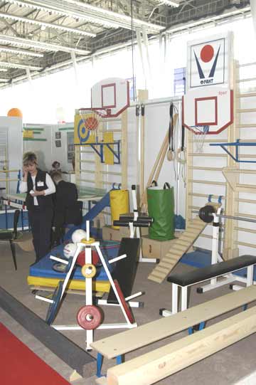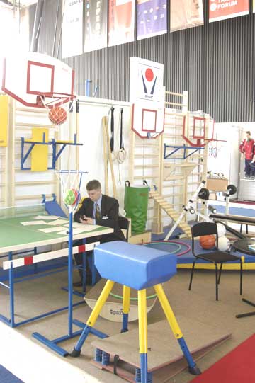 Разнообразием радует глаз спортивное оборудование. Мячи всех цветов, размеров и видов; резиновые покрытия для занятий разными видами спорта из экологически чистых и красивых материалов; легкие, компактные, быстро собирающиеся тренажеры для занятий фитнесом, аэробикой, боксом, айкидо; передвижные установки для баскетбола, тенниса, волейбола и даже для гольфа (любое школьное поле можно оборудовать с помощью искусственной морозоустойчивой травки или песка).